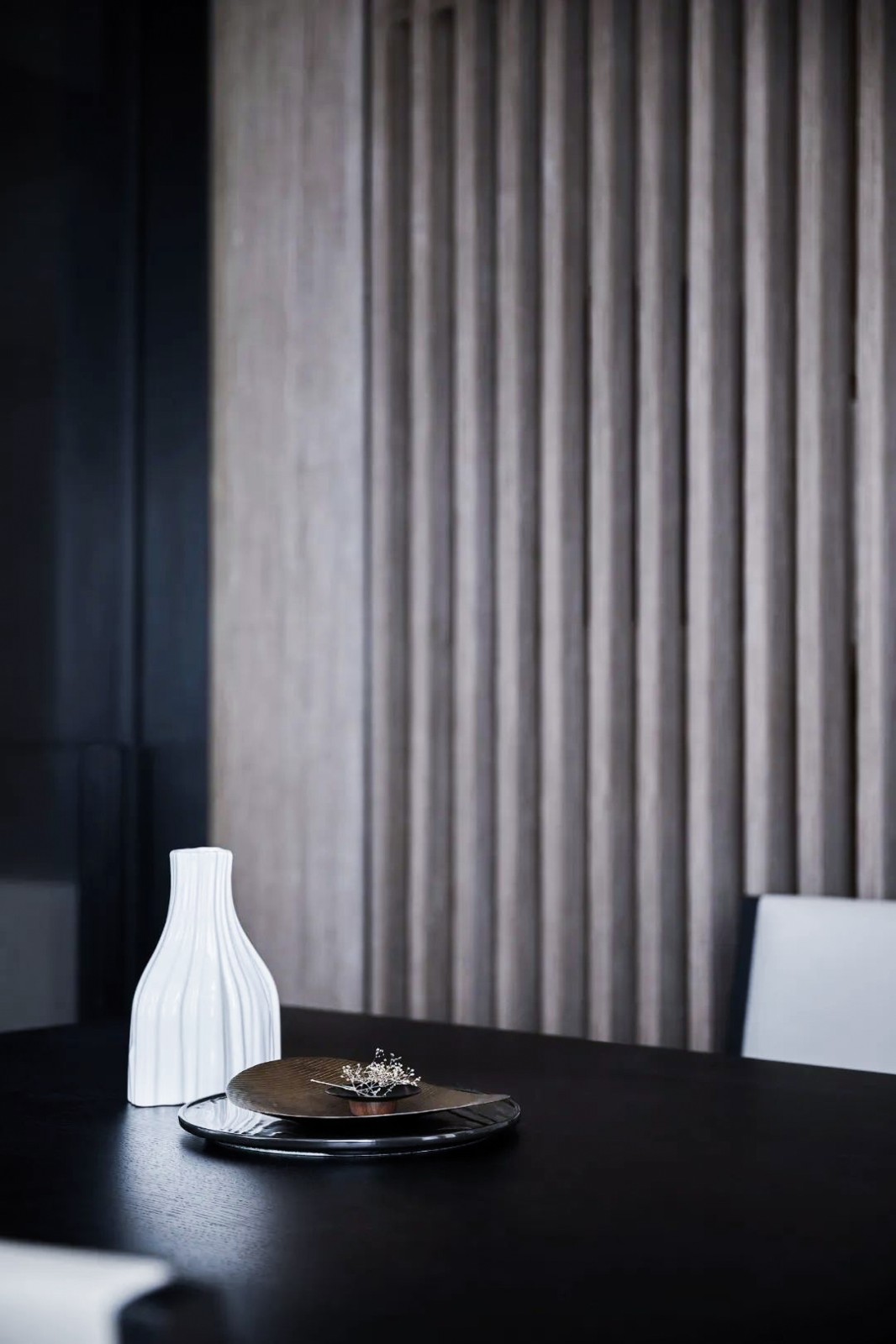 In the semi-surrounding enclosure, the dining room and kitchen are harmoniously connected by the wired glass. The rhythmic wooden grilles and light strips resemble the twinkling starlight in the mountains, creating a pleasant and romantic dinning atmosphere.