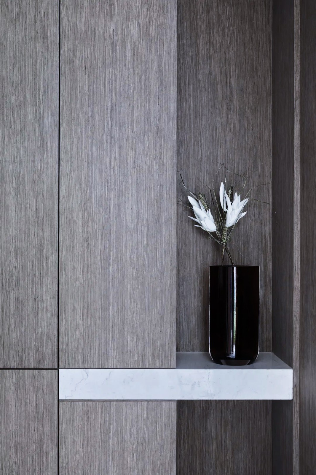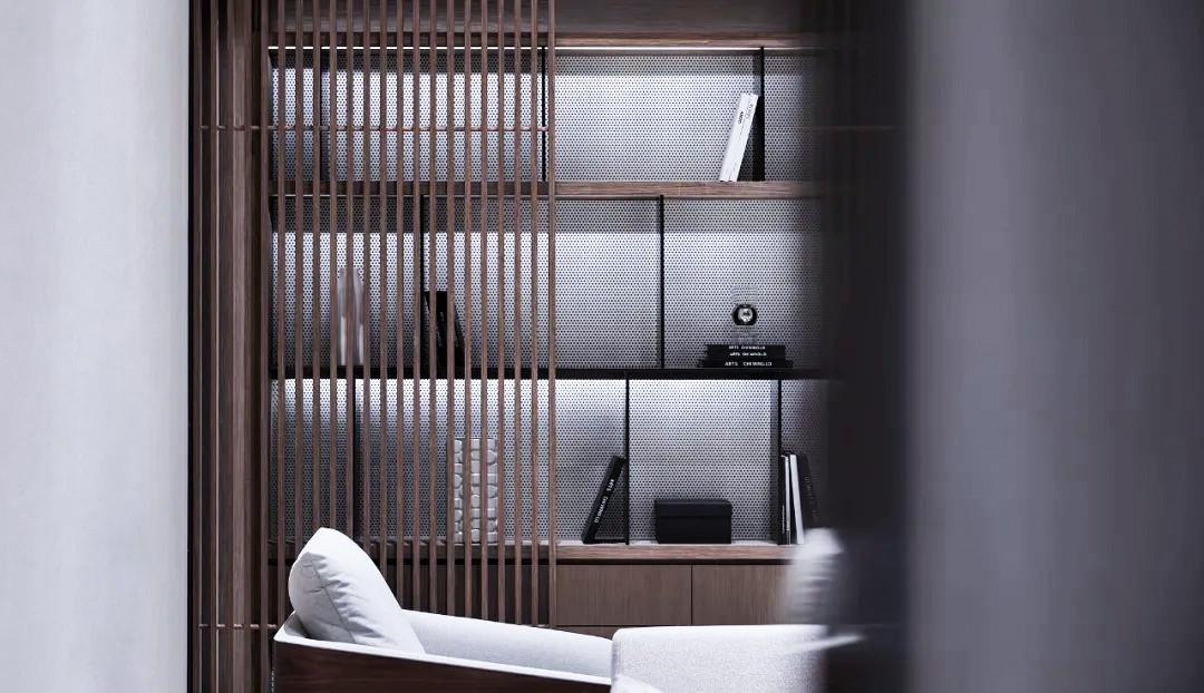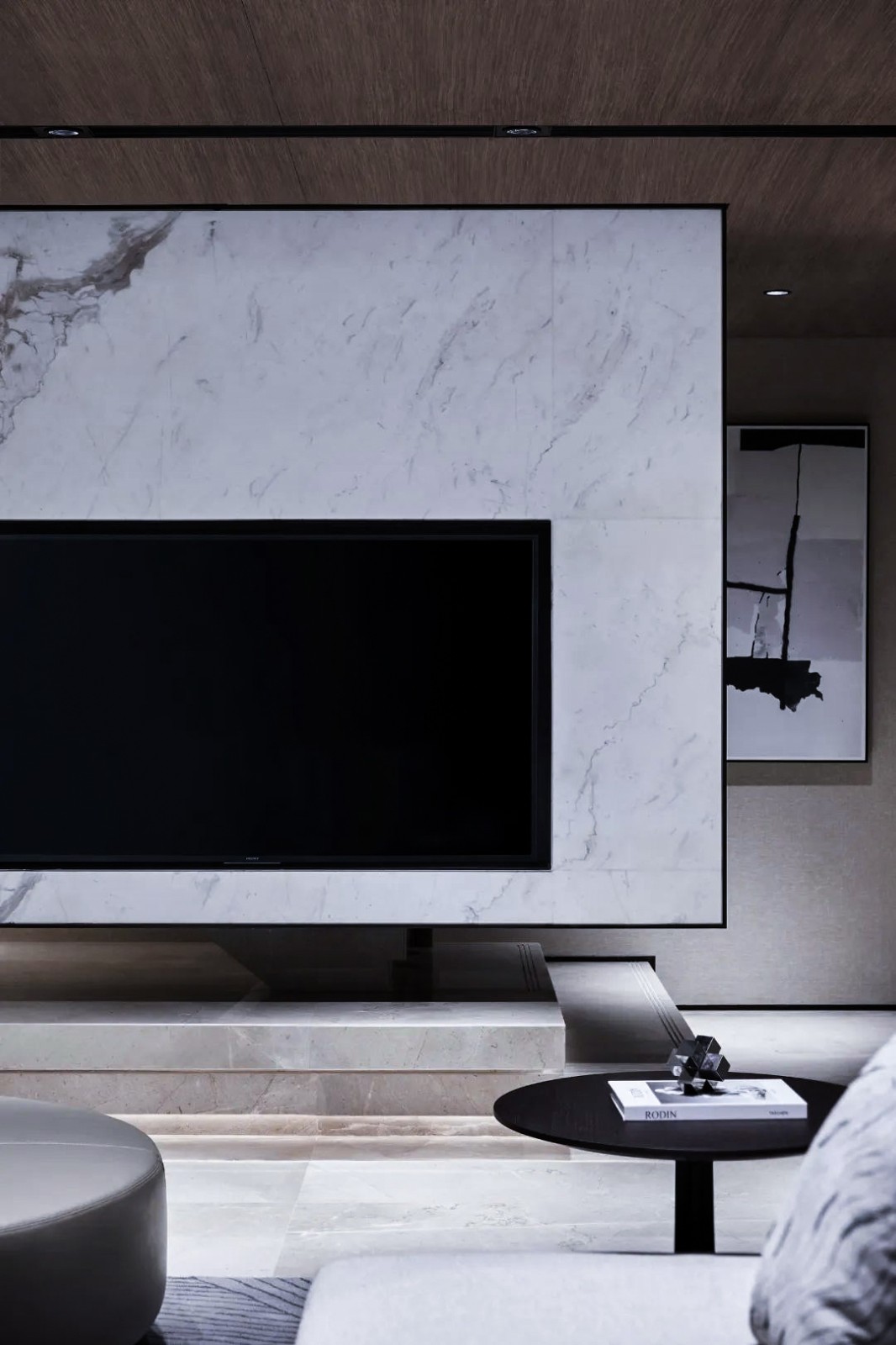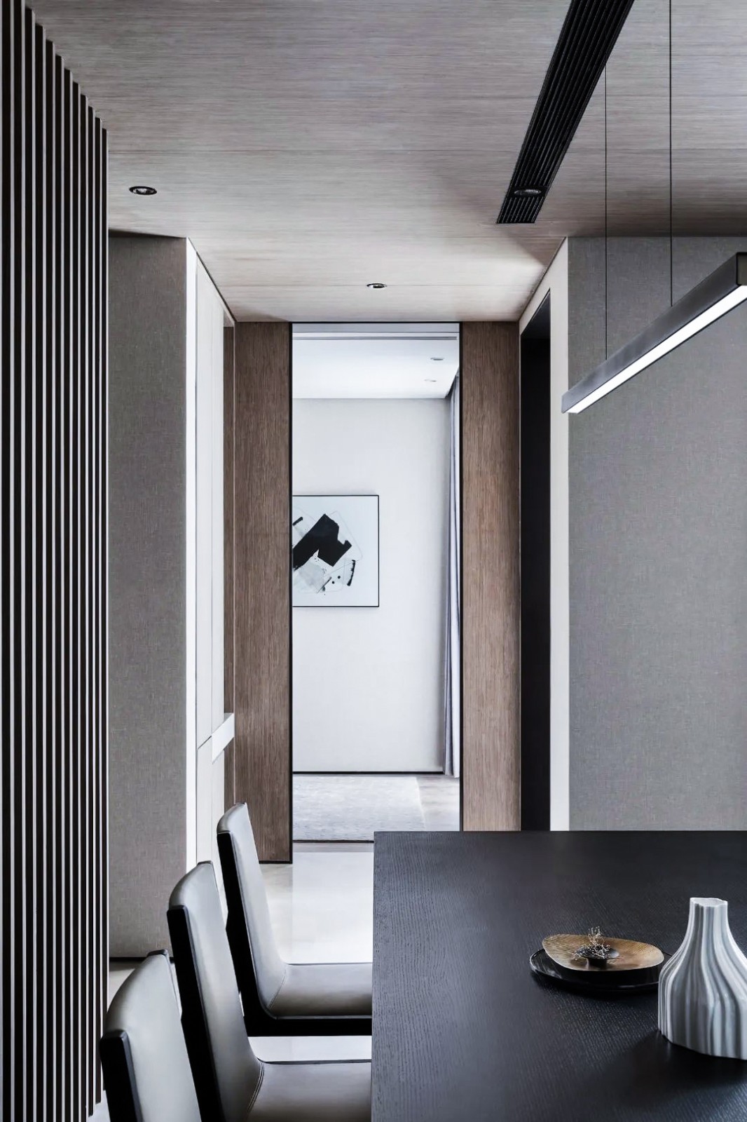 The free form of kitchen, bar and dining room further improves the sense of dimensions, as well as the comfortable and convenient living experience. The lacquer and metal run through the space, combined with the collisions and contrasts between vision and texture, offering a subtle openness and interaction.