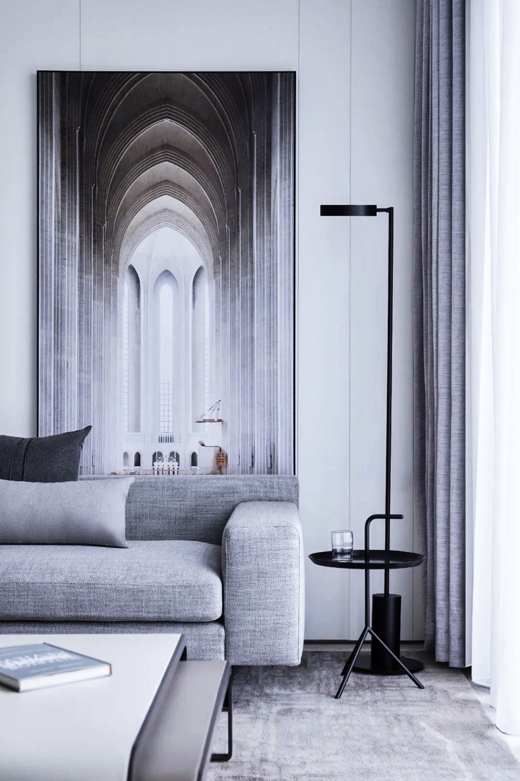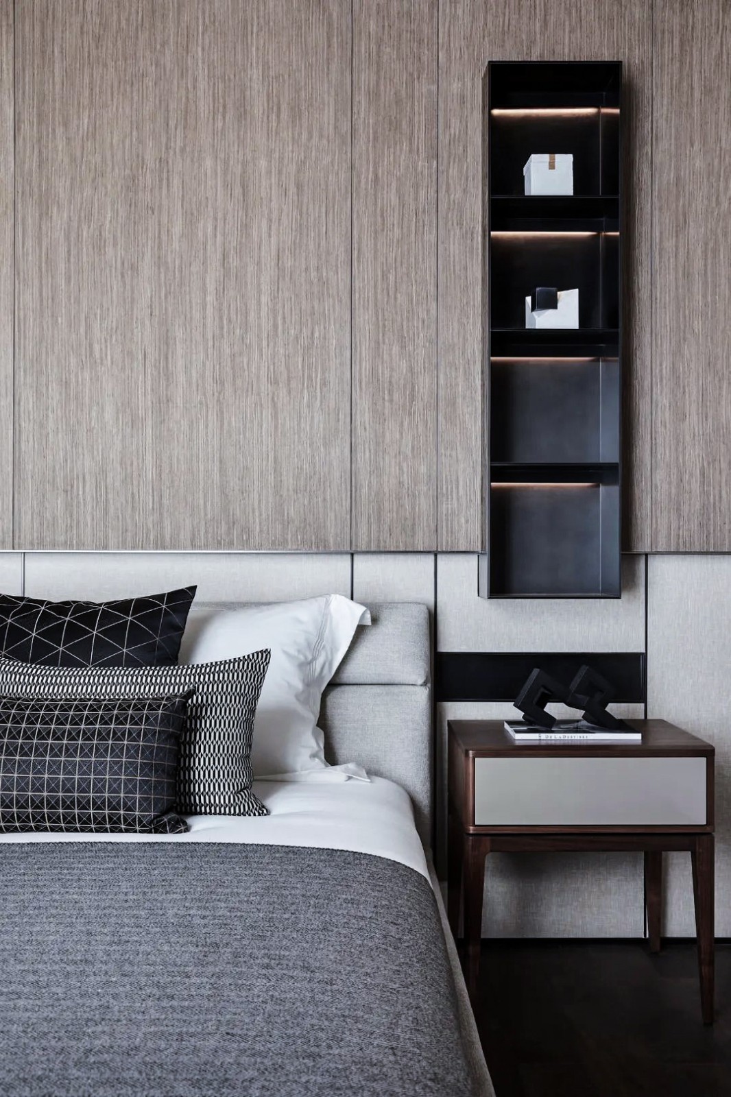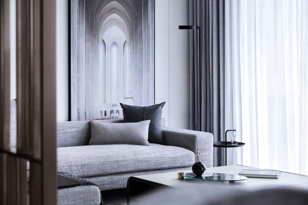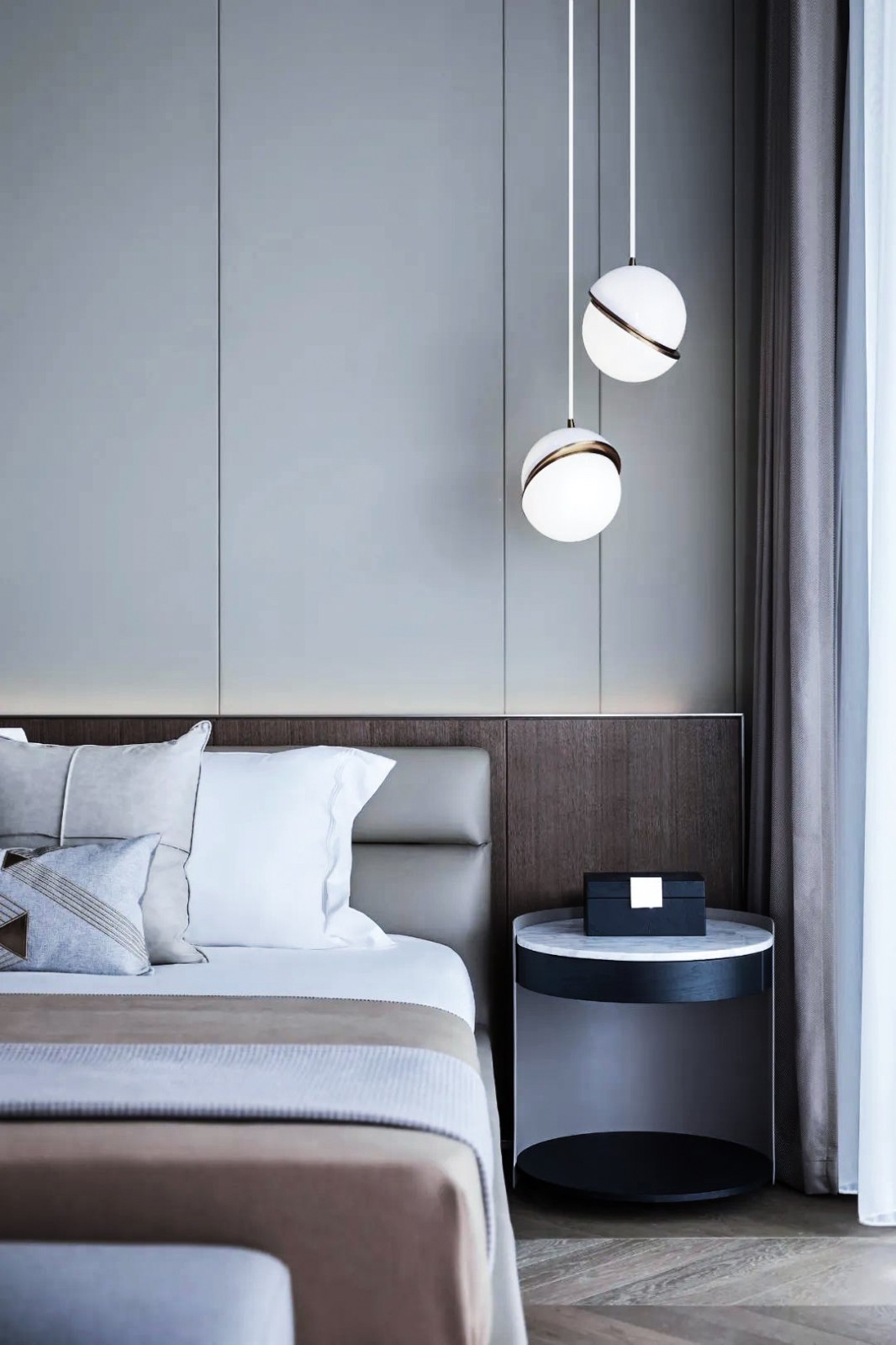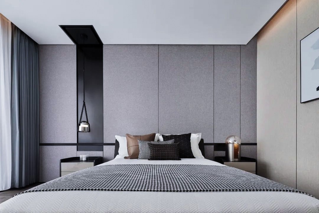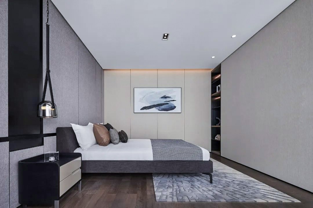 The different shades of gray in the second bedroom suite give an elegant and subtle expression, which fully reflects the authentic and peaceful lifestyle. The connection of upper and lower brushed stainless steel plated with black titanium breaks the monotony of the solid color background of the bed and adds dynamism to the space.