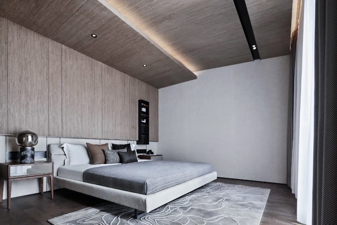 The master bedroom suite on the second floor is the perfect embodiment of a penetrating and interesting space design. The designer seeks inspiration from the layered mountains and created a well-proportioned design with the extension, interweaving and collision of large areas. The wooden grille sliding door exudes a unique kind of freedom and softness.