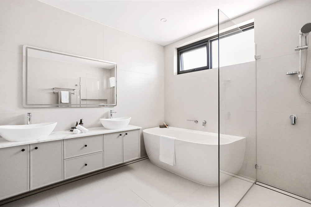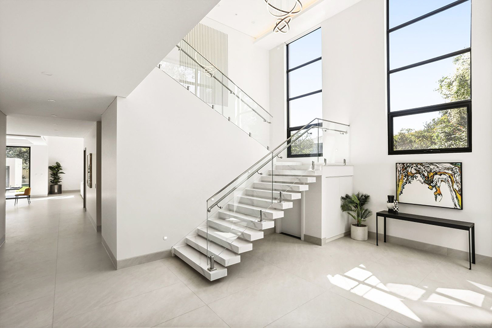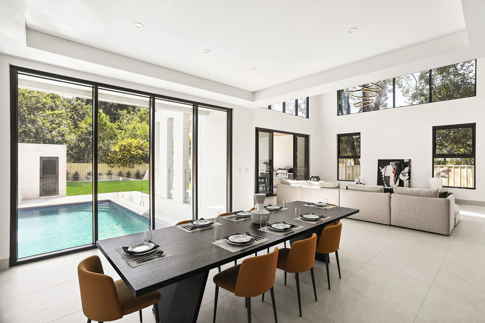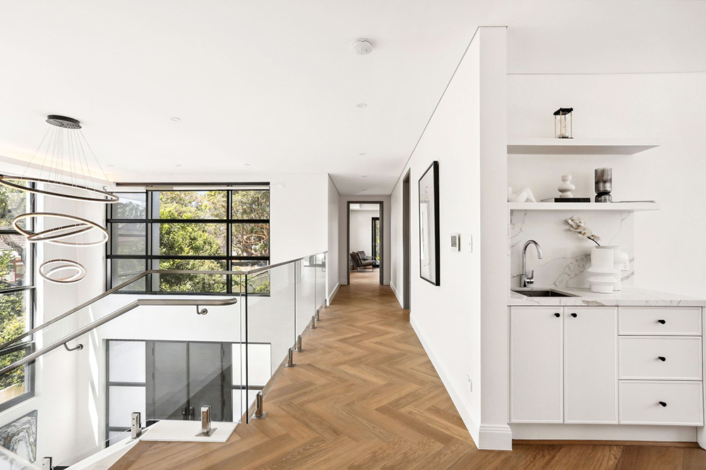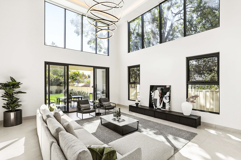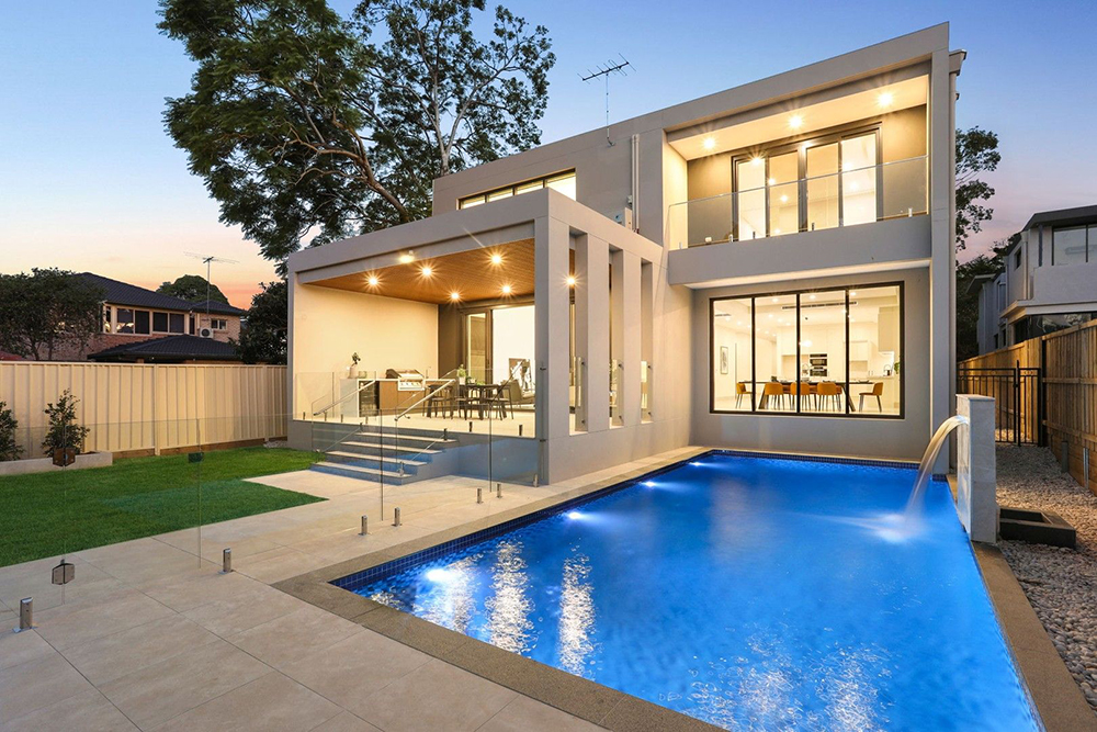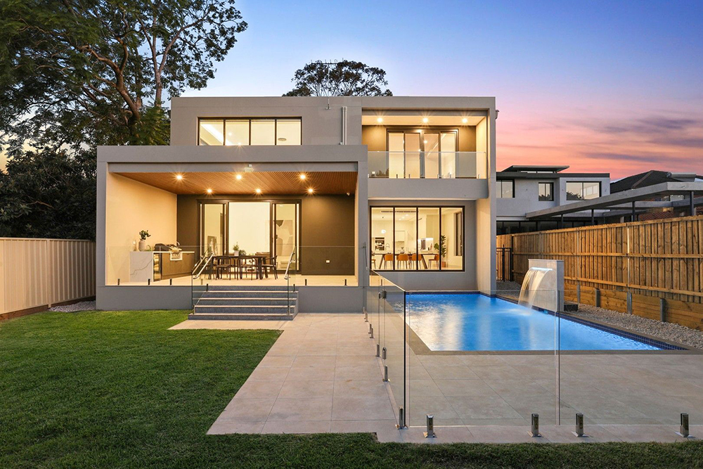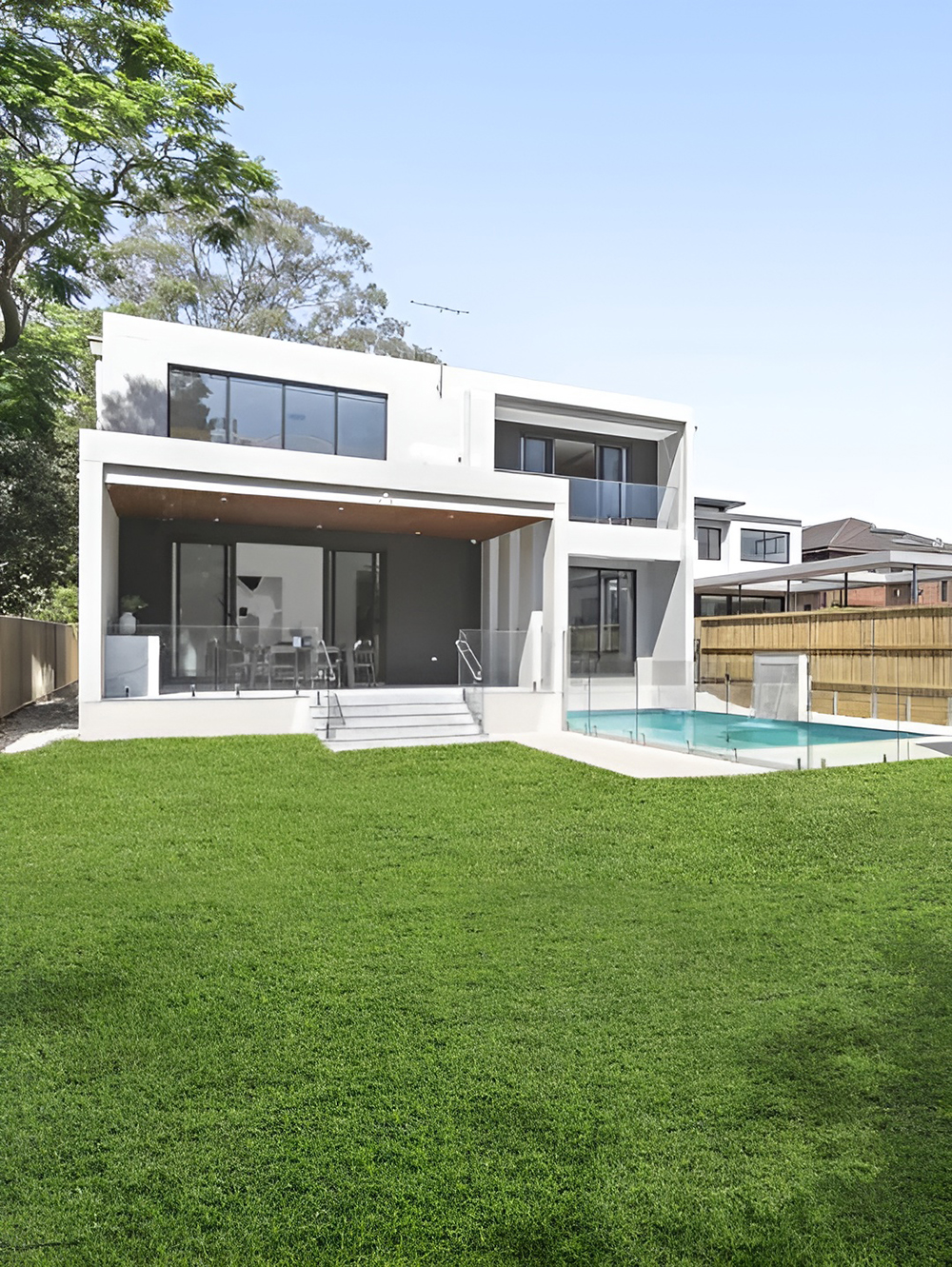 59 Oxford Road, Strathfield, is a clean and tidy two-story white building. Covering an area of approximately 1,000 square meters, it features a modern architectural style with a square structure and interwoven elements. Set against a lush green lawn, it appears even more sleek and minimalist, free from any unnecessary embellishments.