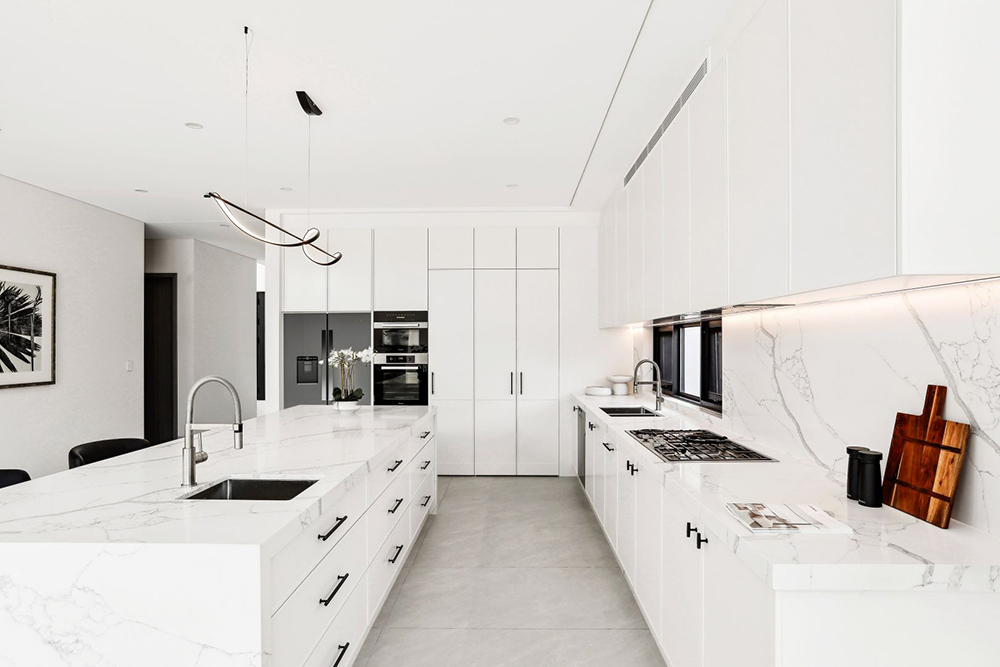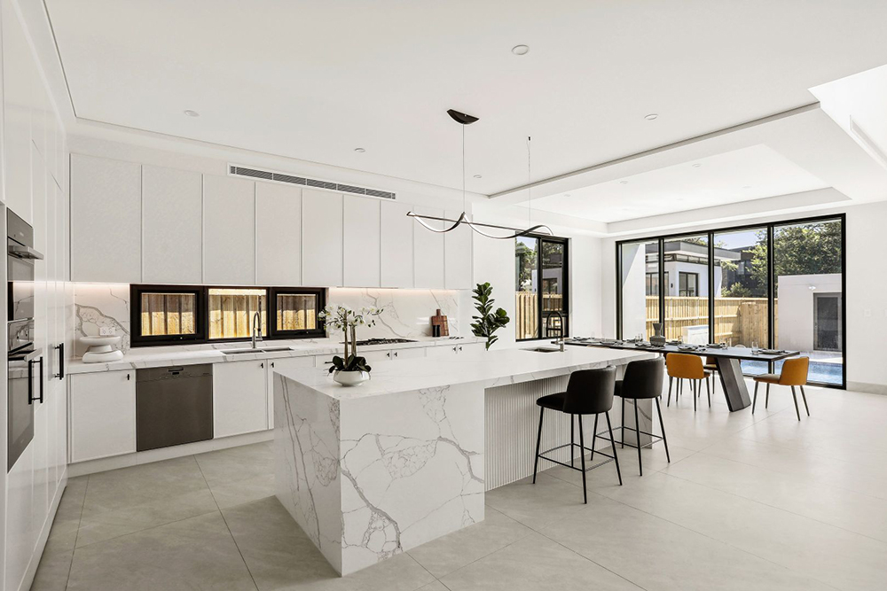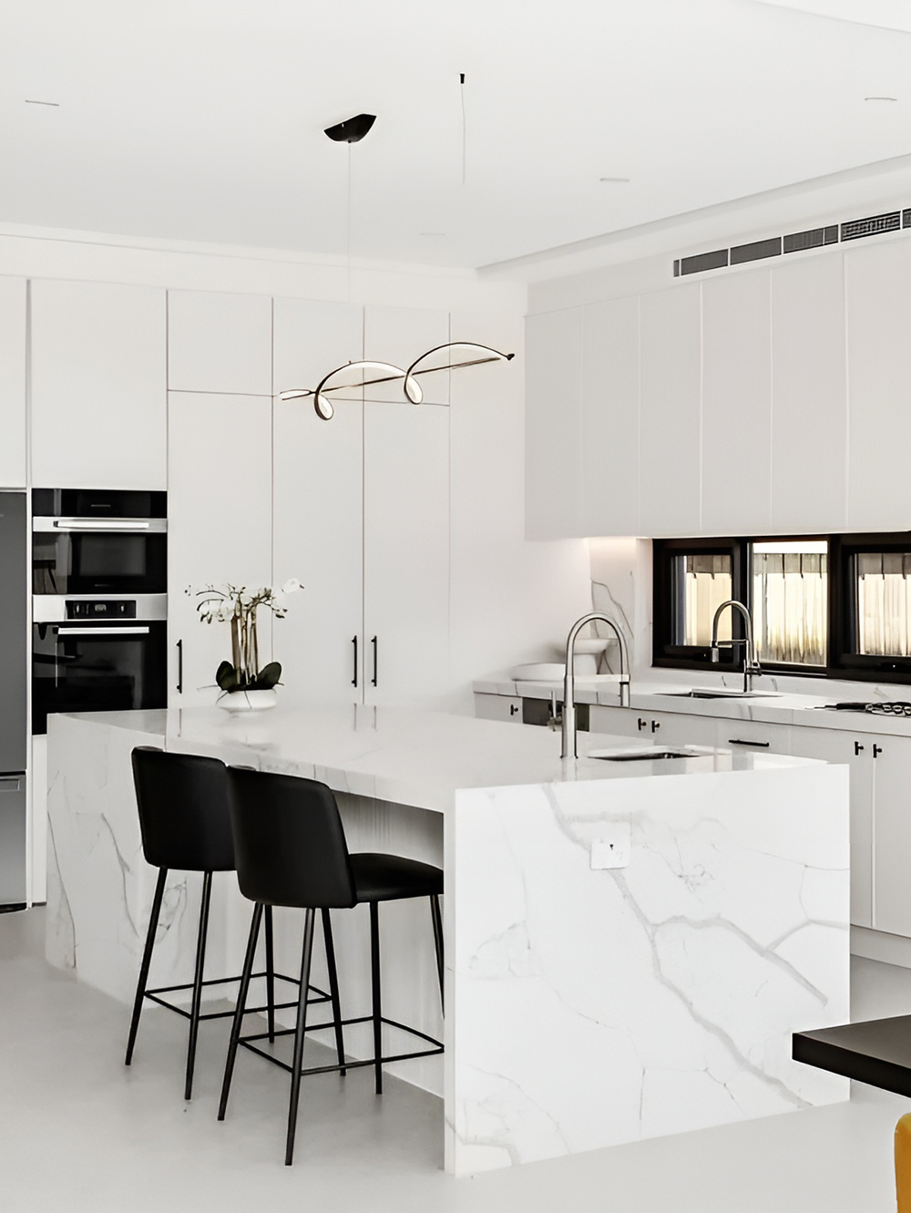 On the other side of the dining area is an open kitchen with an island. White wood panels and marble surfaces give the kitchen a spotless, clean appearance. Two black BALLET bar stools stand gracefully by the island, adding a touch of modern charm to the space.
