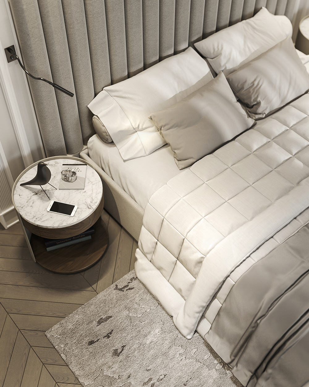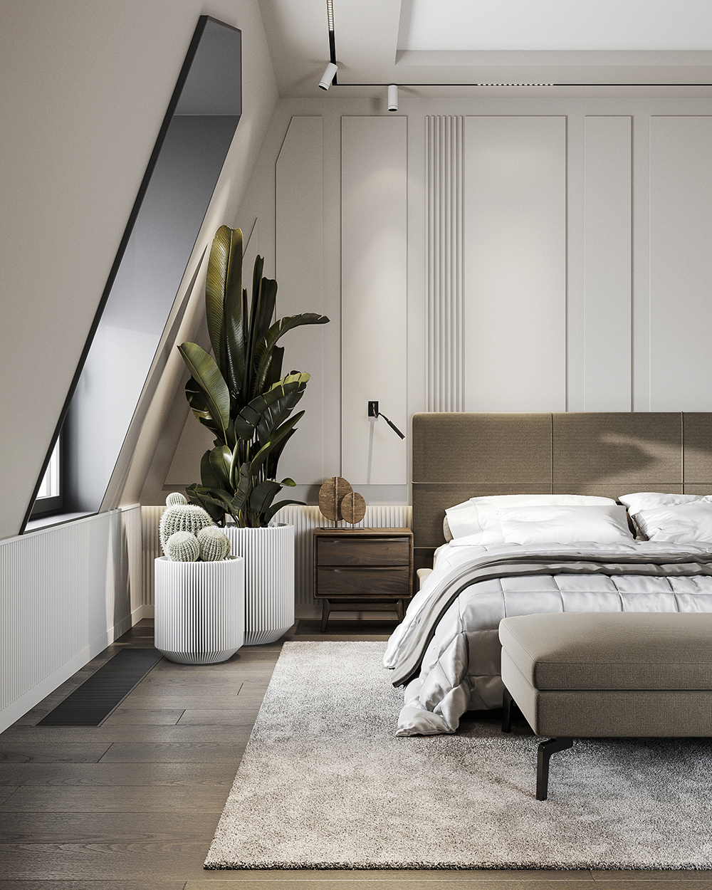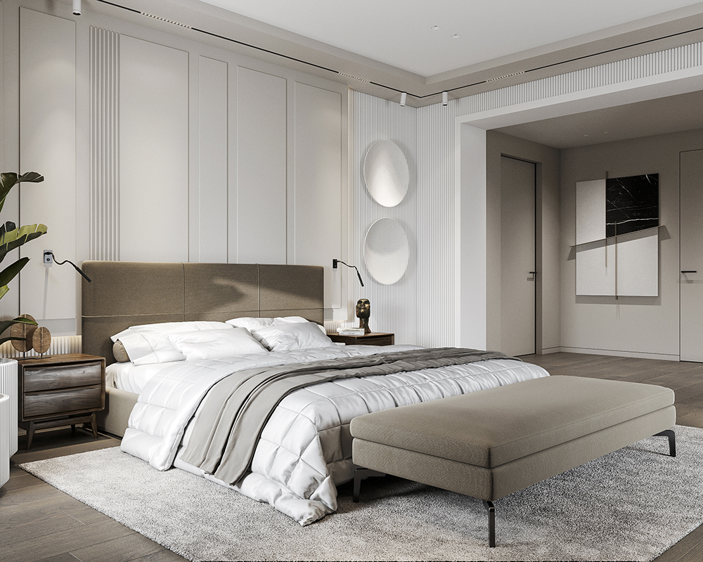 主卧采用柔和的灰色和棕色,