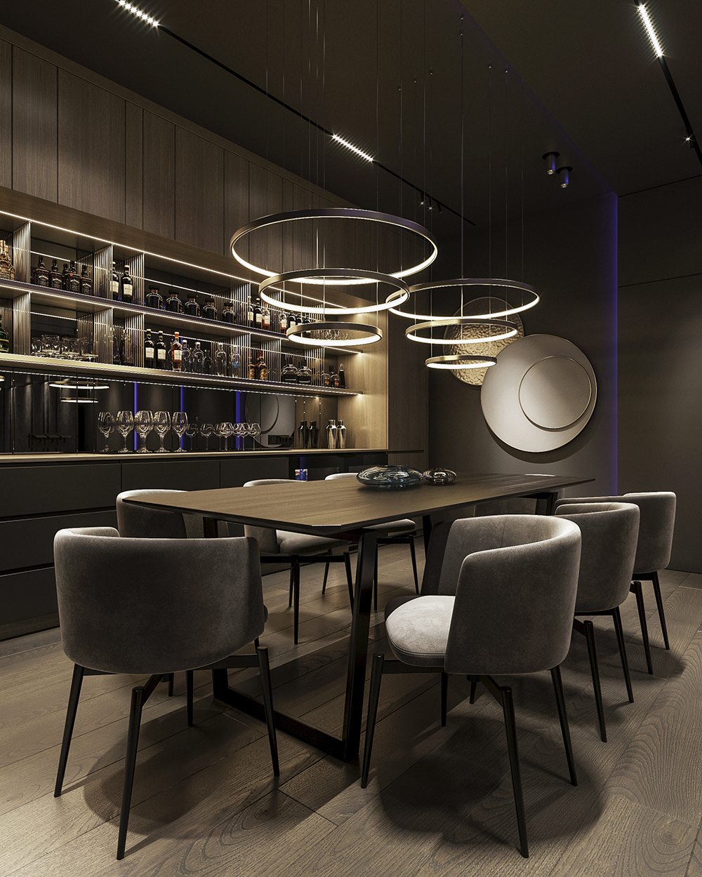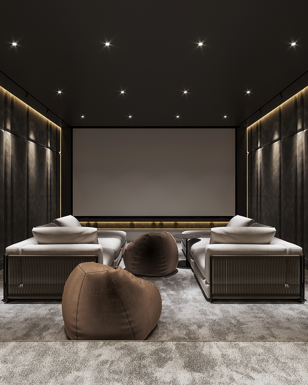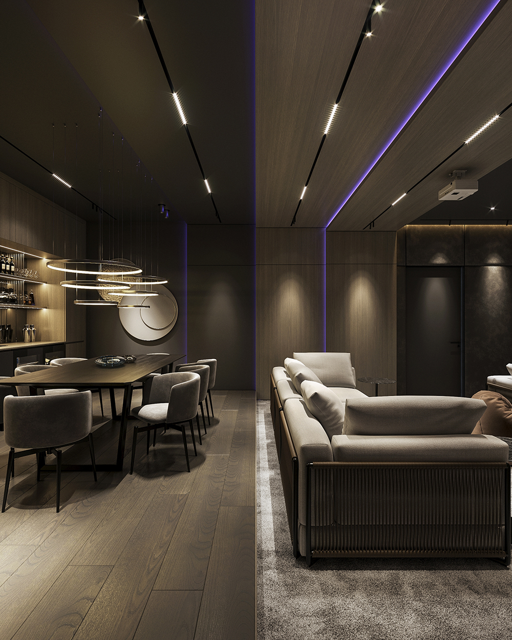 深色木饰面让这里成为天然的影音室和酒吧。