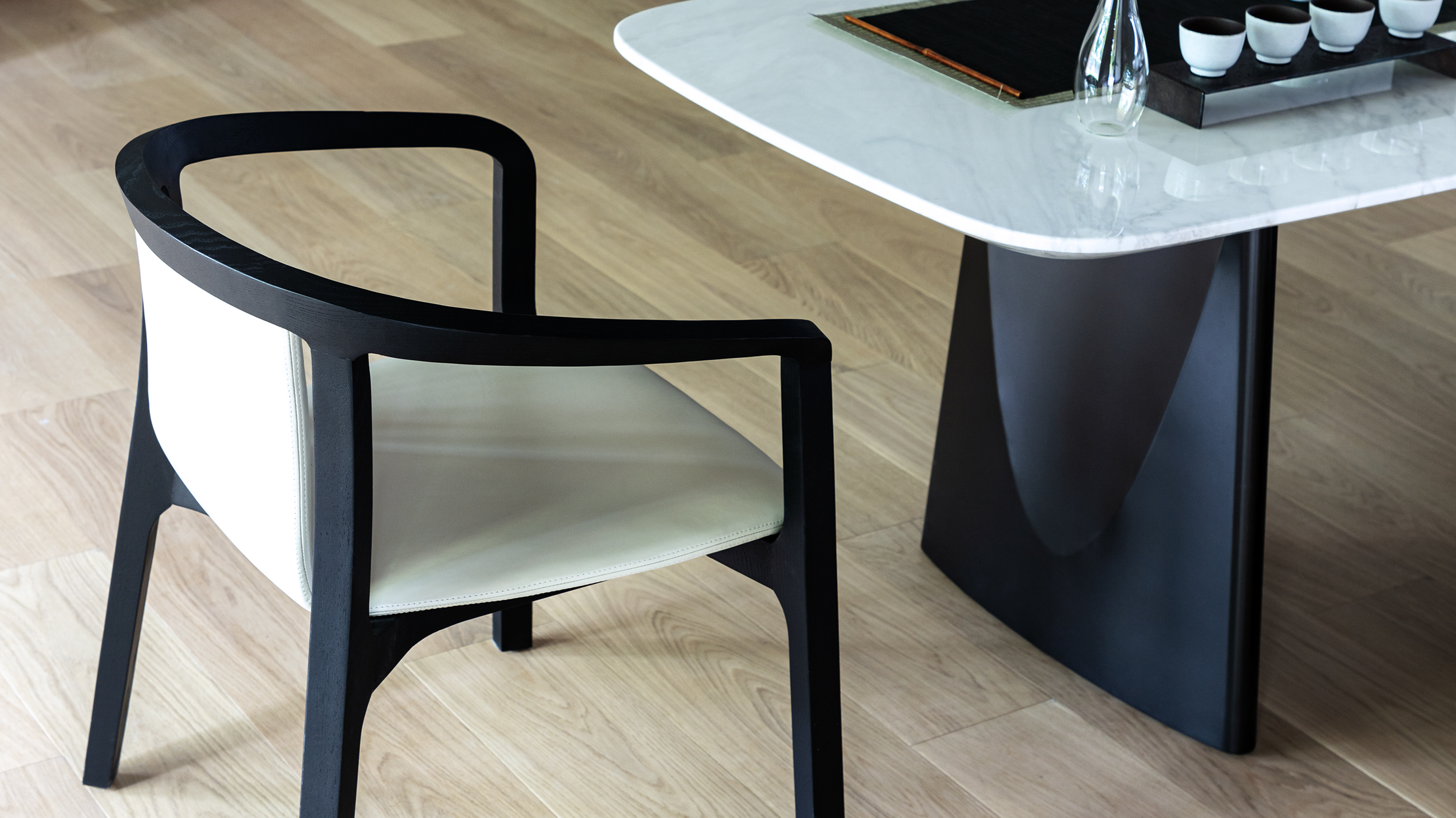 该系列结合工艺美学,融入经典明式圈椅元素,框架采用传统的榫卯工艺。同时符合现代家具的审美,造型简洁利落,线条凝练流畅。ESSENCE源椅系列包括餐椅和休闲椅。