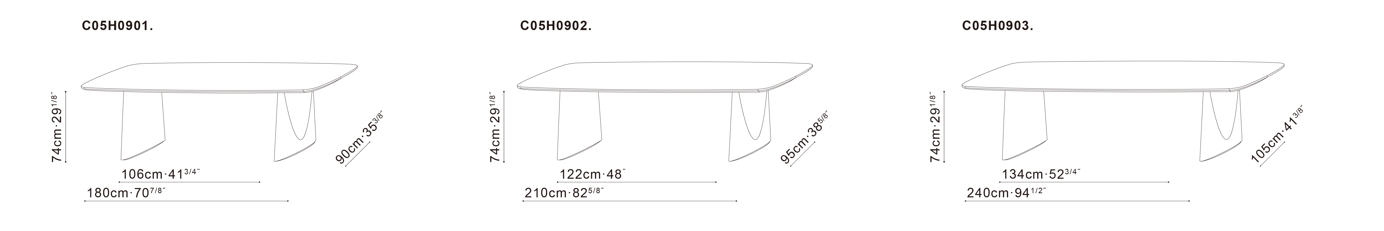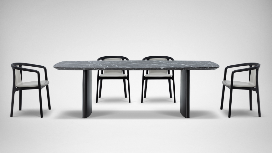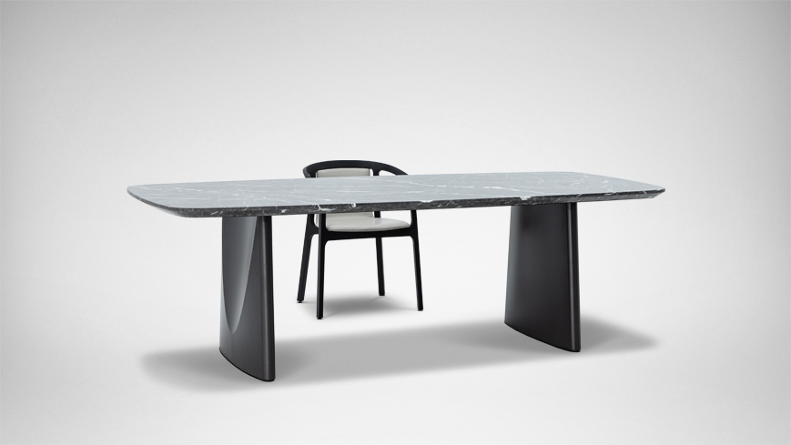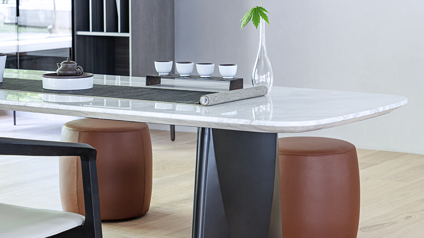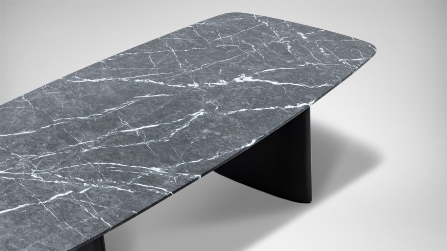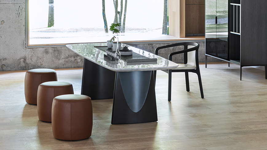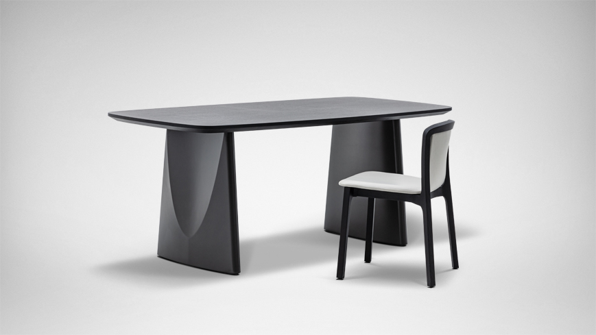 椭圆形桌面新颖独特,弧线勾勒出产品的特征与气质。将折纸的概念融入桌腿的设计中,提升雕塑感的同时,哑光的金属质感为其增添沉稳气势。