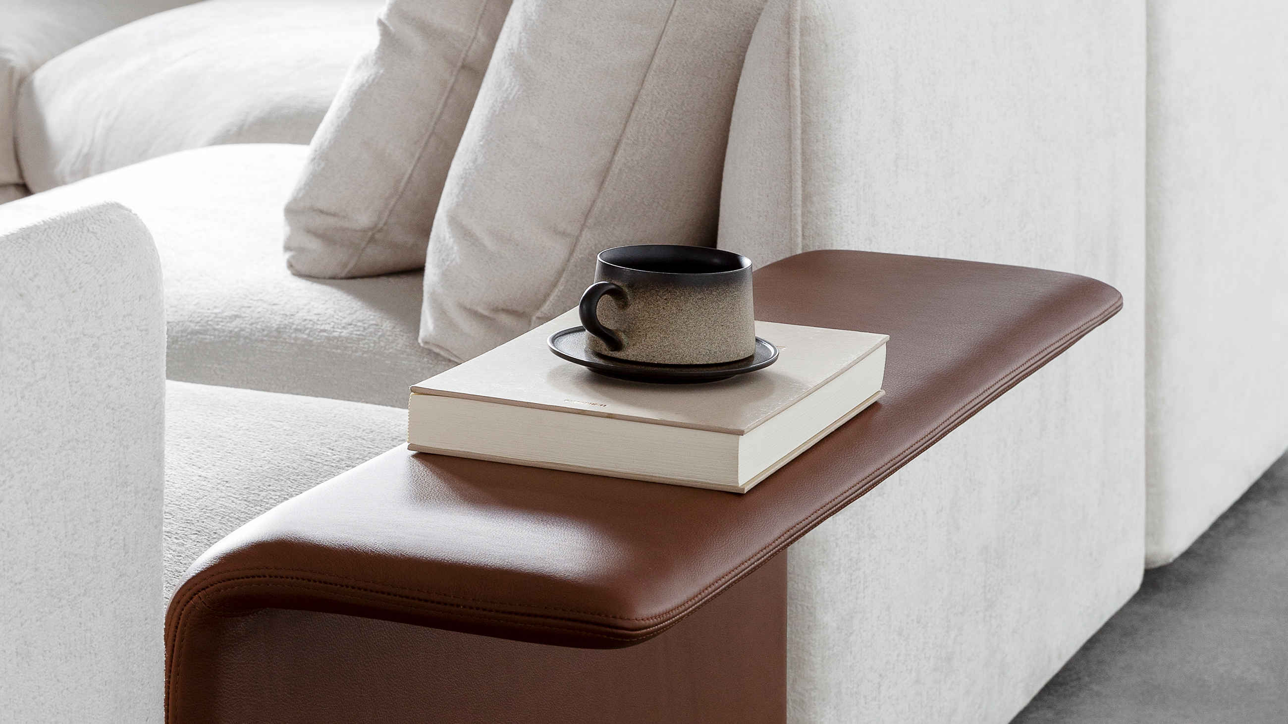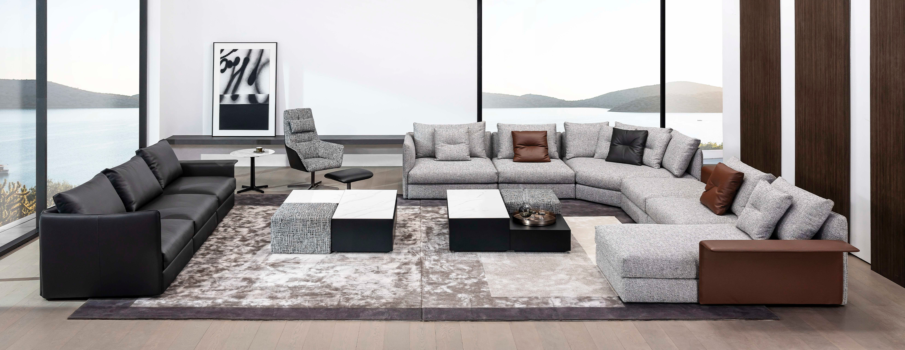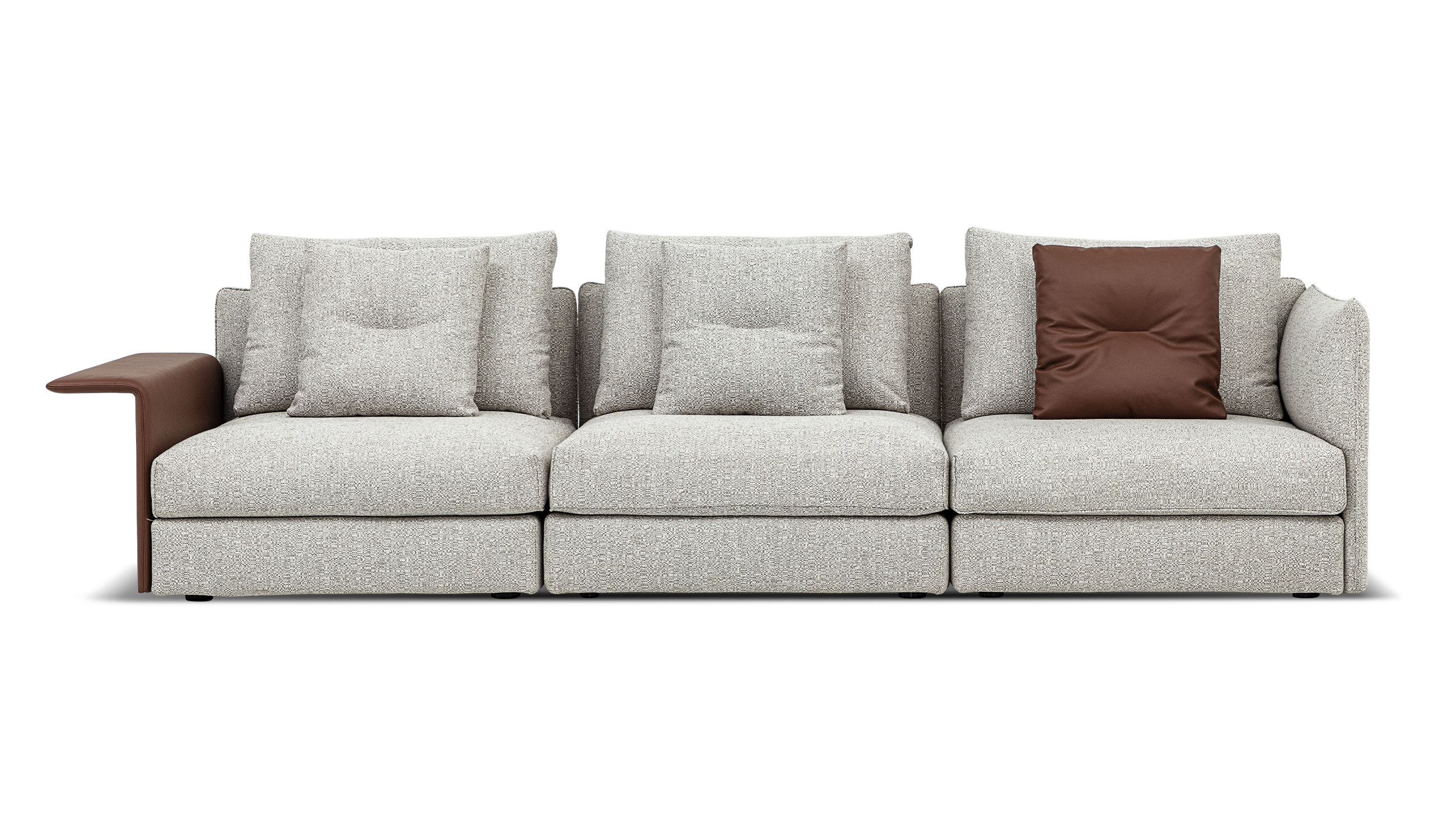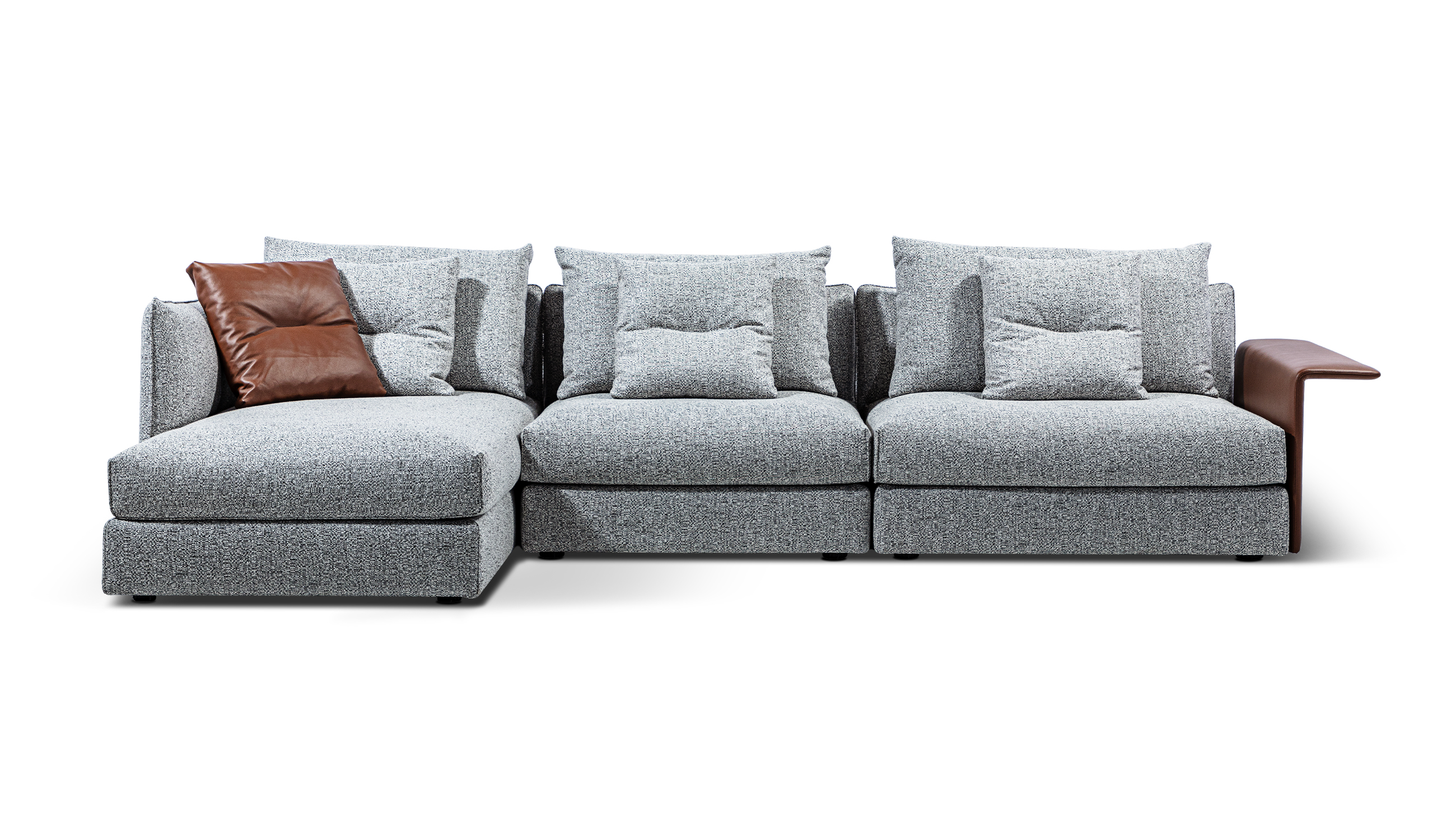 L型扶手,位置随心而动,增加空间和功能的多元性;六边形转角位,带来非凡的组合能力;靠包采用一字型拉线装饰,丰富视觉美感。