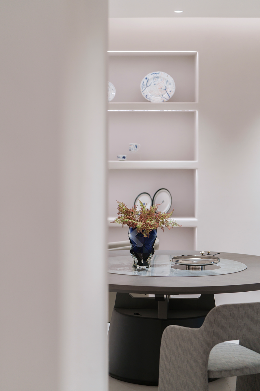 锐驰在生活美学空间的陈列设计中,采用了极简风,化繁为简恰如大音希声。同时青花瓷盘、玻璃装饰与圆形餐桌等元素的协调搭配,又为整体设计增添了生活的温度。