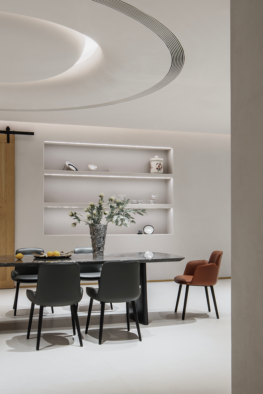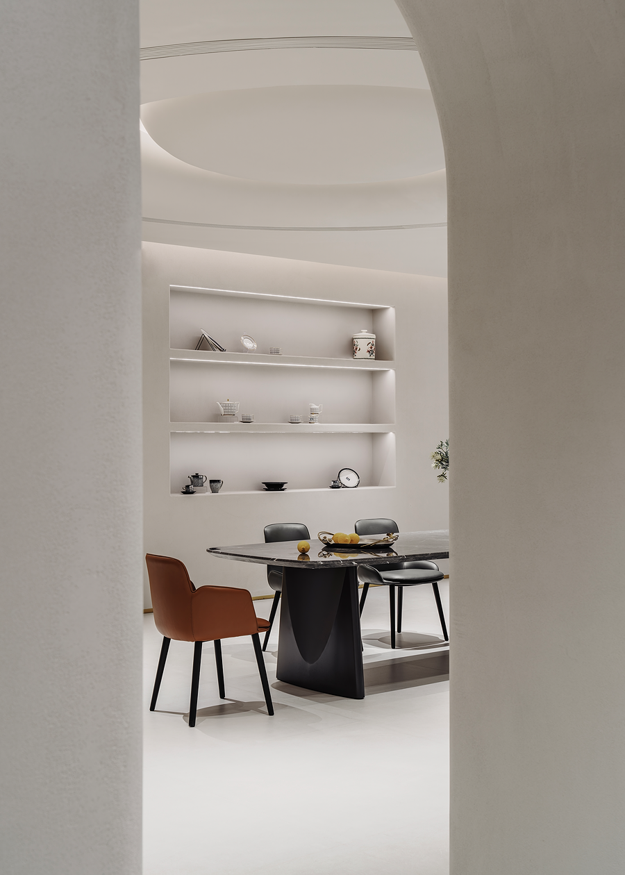 长餐桌区域OLIVE橄榄桌深色大理石桌面,充满质感,彰显主人的不凡与对来客的重视。空间中的拱形元素呈现出优美曲线与弧度,让空间不再单调沉闷,同时与OLIVE橄榄桌的弧形线条相呼应,让空间与空间之间实现更好的过渡。