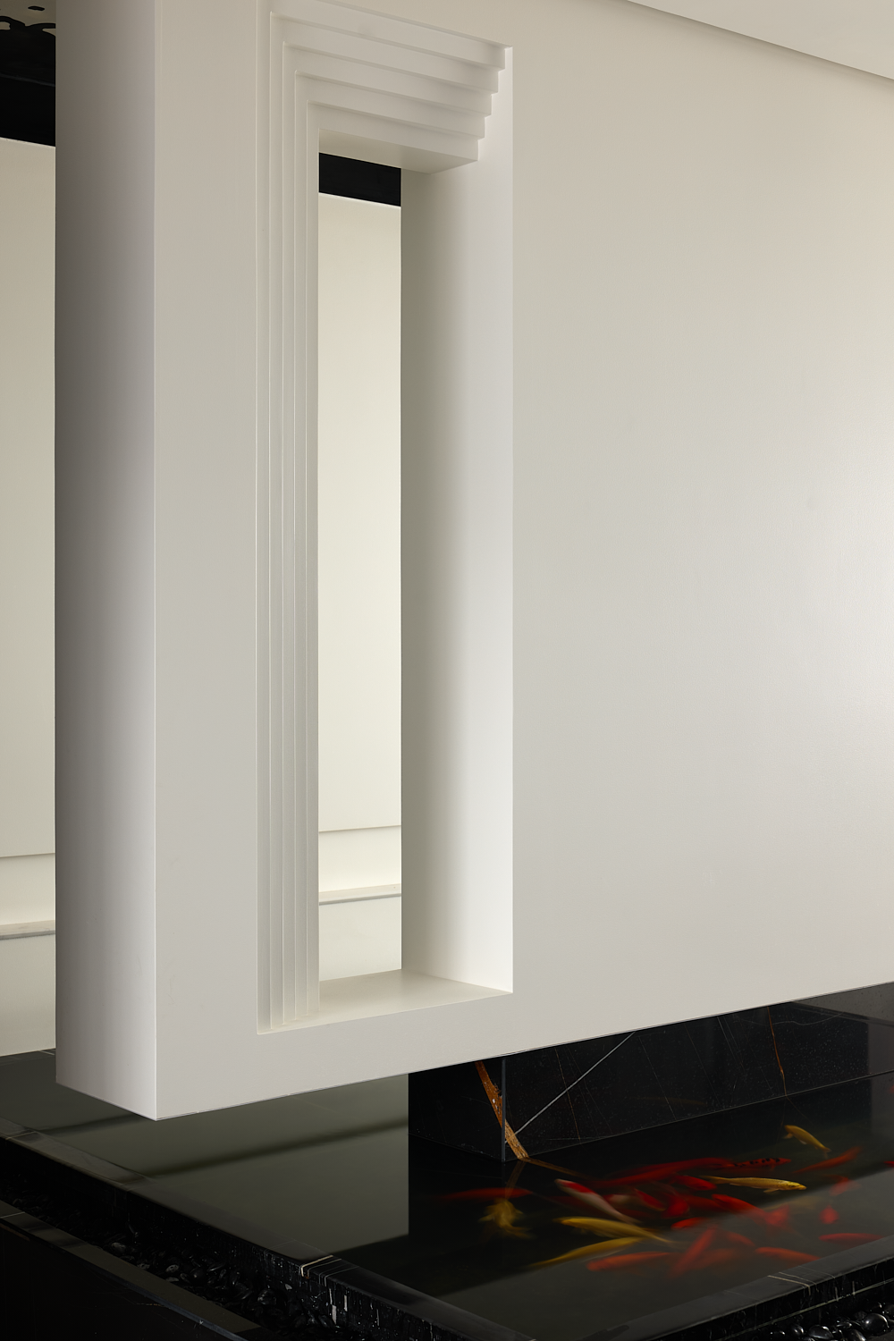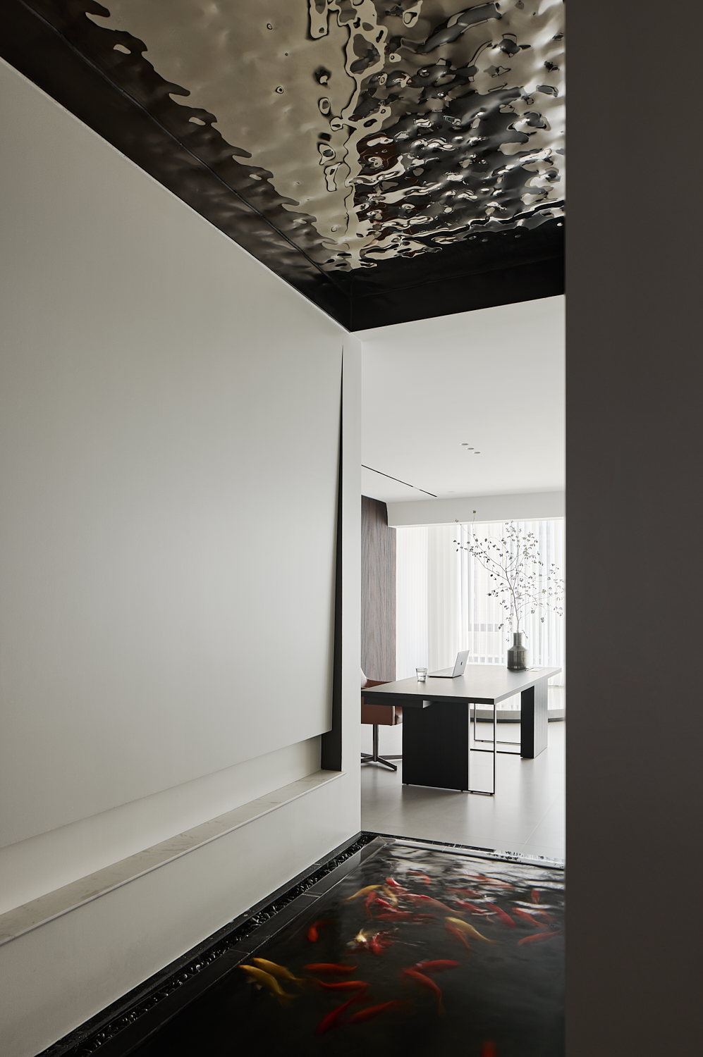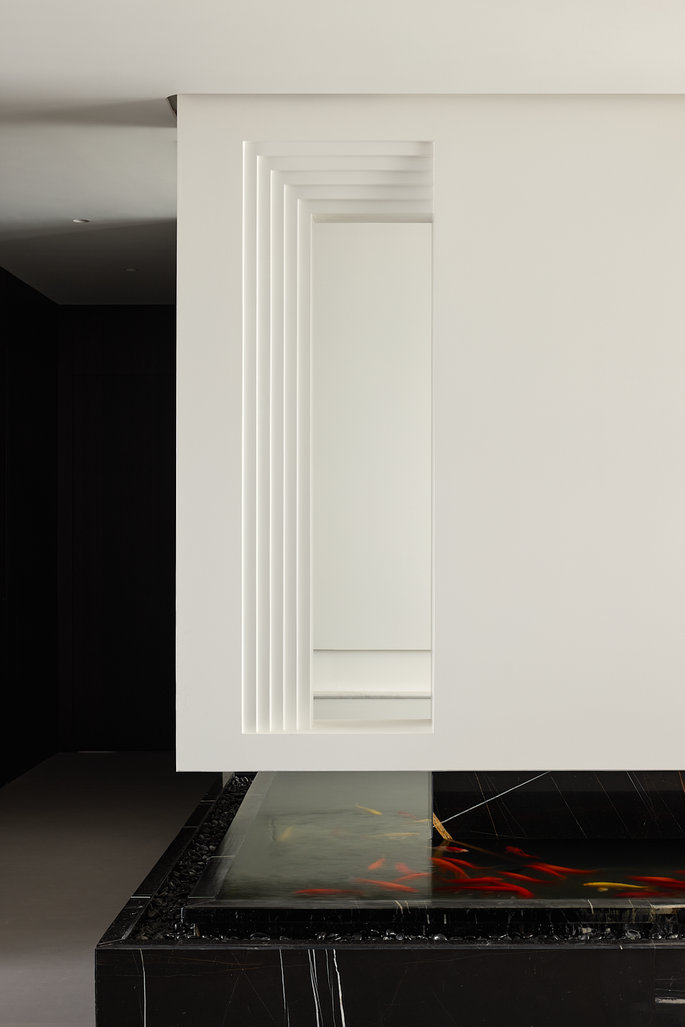 玄关设计独特,灵感源自宋词“盈盈秋水,淡淡春山”。步入玄关,仿佛踏入“秋水之韵“与“春山之态”的一幅立体画卷。水池中,游鱼在光影交织下,轻盈地穿梭,使得“秋水”具象而灵动。水池对面的灰色墙垛,则如同两座“春山”,沉稳而又不失生机,与鱼池中的“秋水”相互呼应,一静一动,构成了一幅和谐的自然画卷。归家后,这片宁静的景象映入眼帘,让人瞬间心神安宁,回归平静。