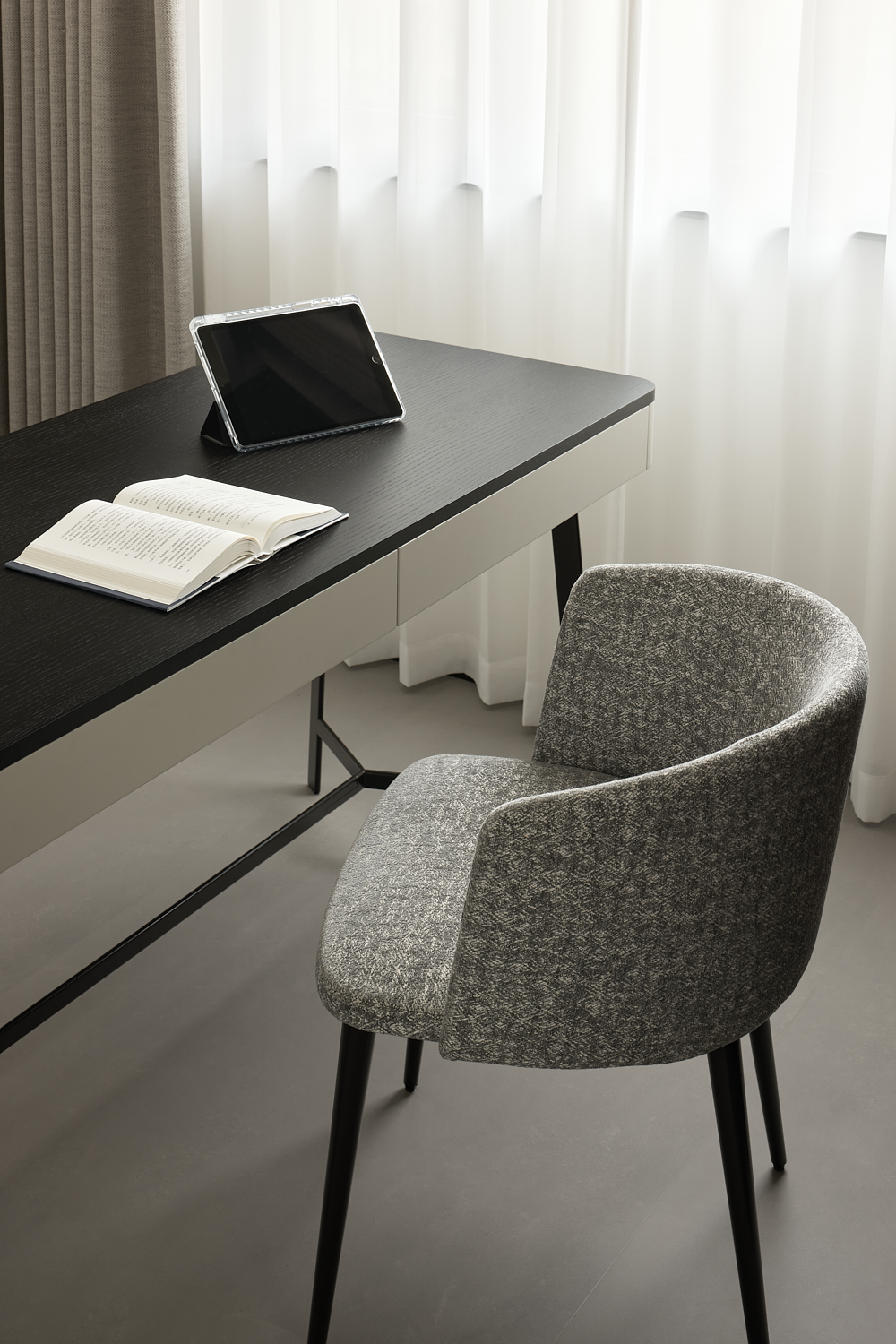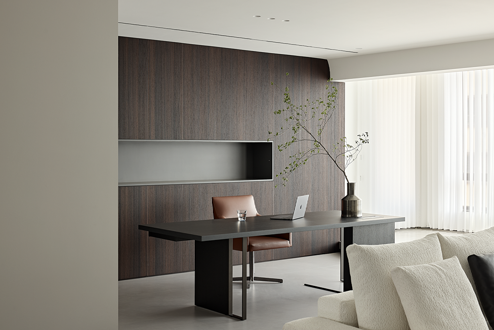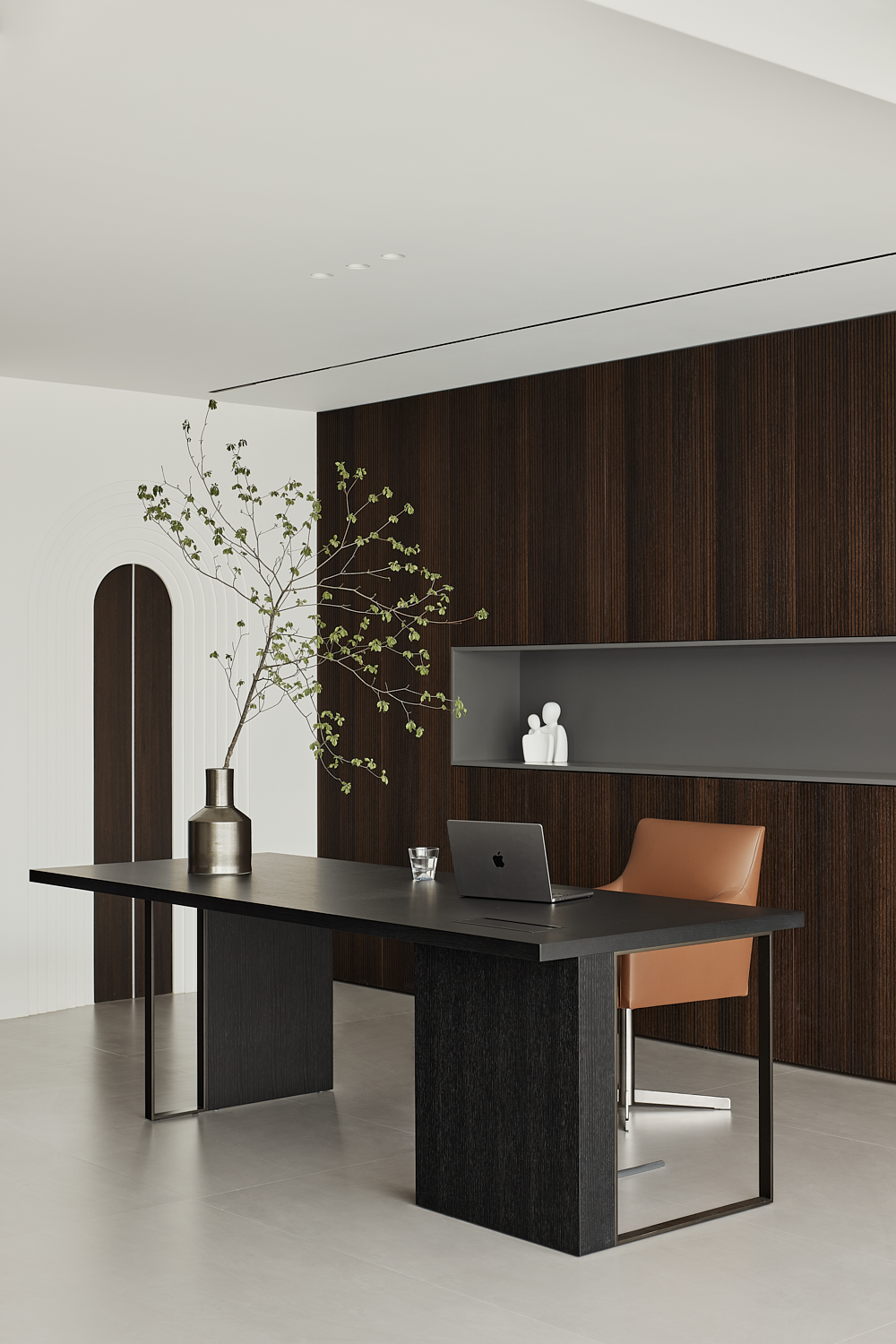 工作区的设计注重功能与美学的结合,直线爽快的TIME时光书桌搭配现代灵动的SOHO书椅,使空间显得井然有序。墙面错落有致,应用斯卡帕叠级的建筑手法,丰富了视觉层次,增加了整个工作区的文化气息。