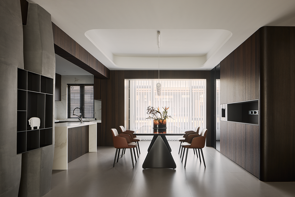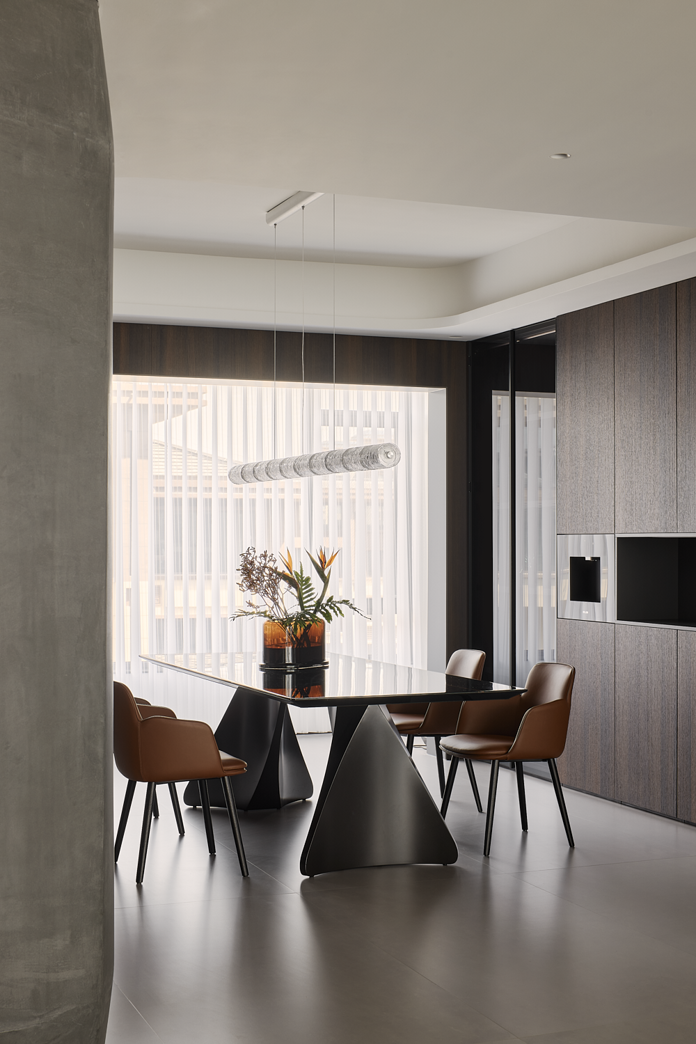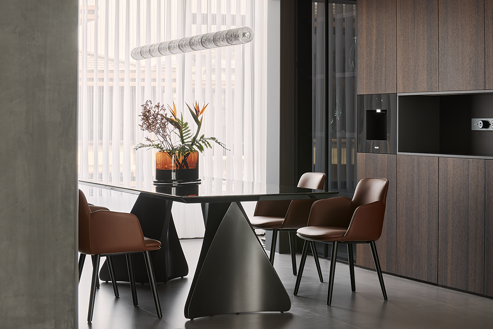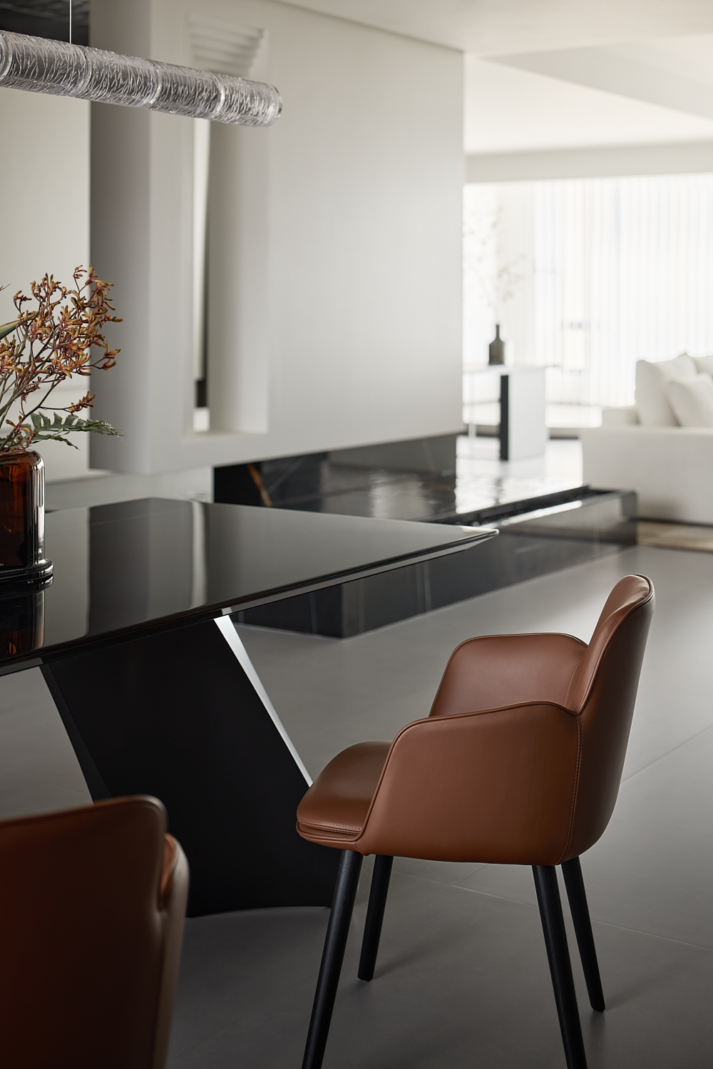 餐厅与客厅相连,采用开放式设计,使整个空间更加开阔。SPIN旋桌与WING翼椅的设计优雅干练,为用餐带来现代雅致的氛围。木质纹理增加了空间的温暖感,绿植的点缀为餐厅增添了一抹生机。