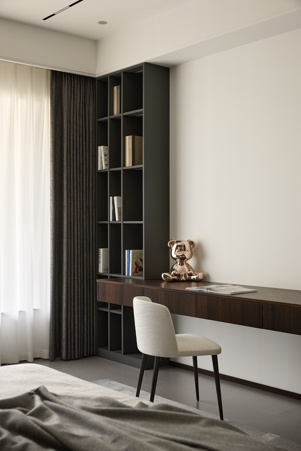 男孩房的设计相对轻松活泼,墙面上独特的线条设计,为空间增添了活力。房间内设有独立书房,方便孩子进行读书习作。整体设计既考虑到了孩子的成长需求,又兼顾到空间的美观性。