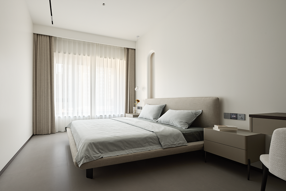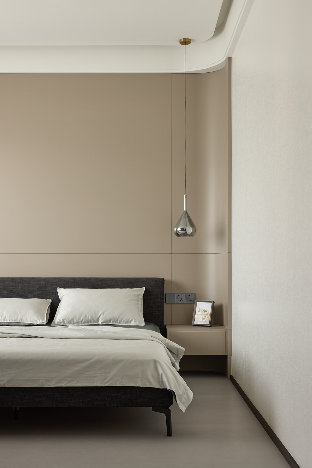 另一间男孩房采用简约的家具与柔和的色调,床头的弧形壁饰增加了空间的趣味性。多功能储物柜,能够满足日常收纳需求。整体的设计搭配为孩子创造出一个充满想象力与探索欲的成长空间。