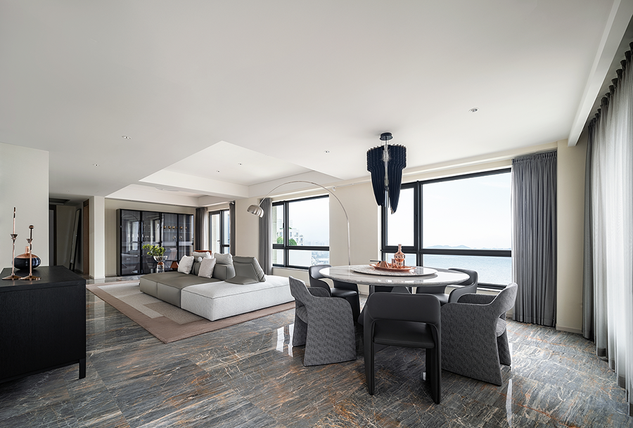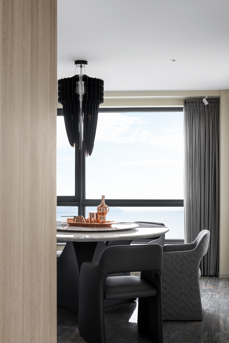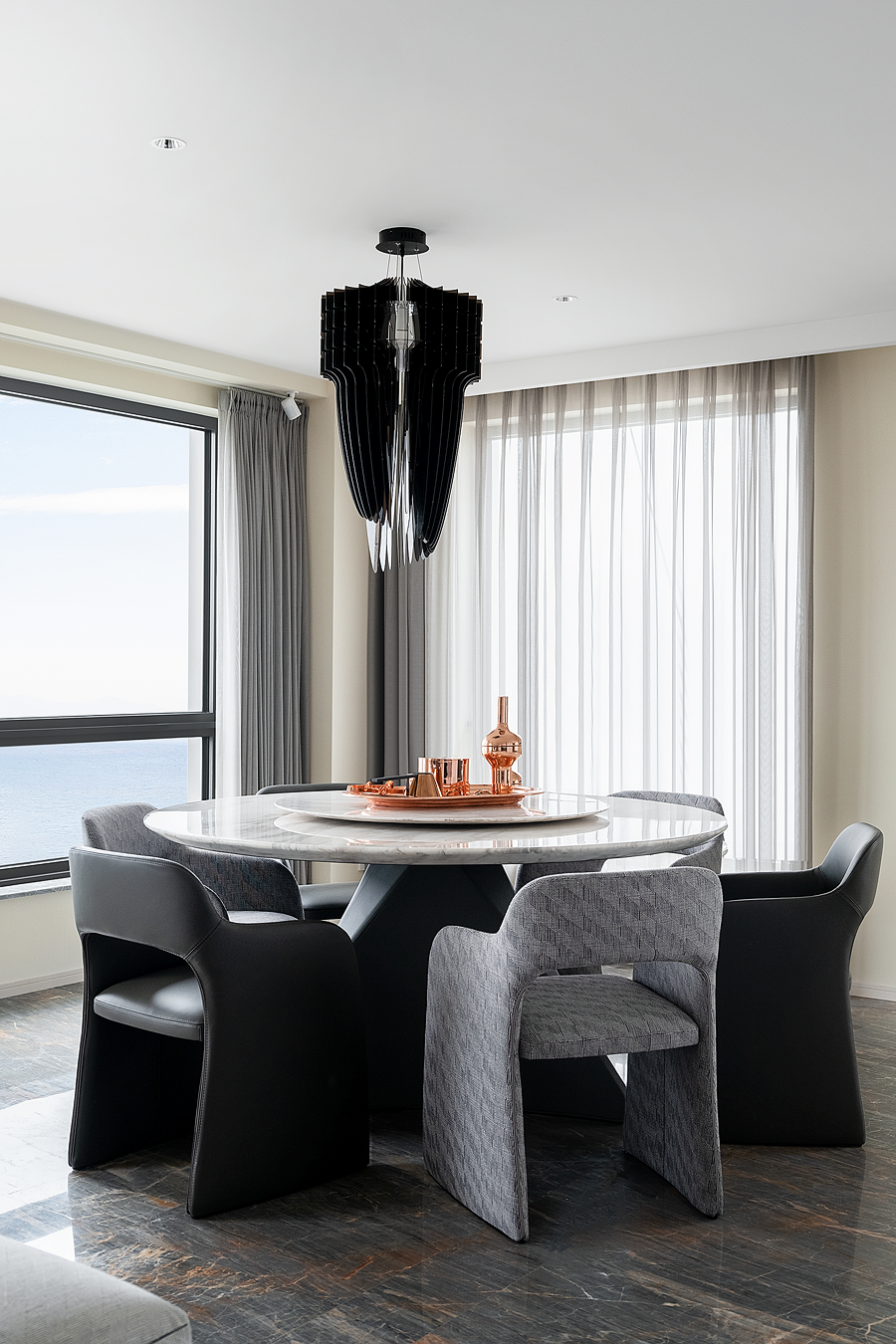 餐厅延续了客厅的设计风格,简洁而不失优雅。大面积的落地窗让居者在用餐时分可以享受窗外的海景,温馨而富有格调。